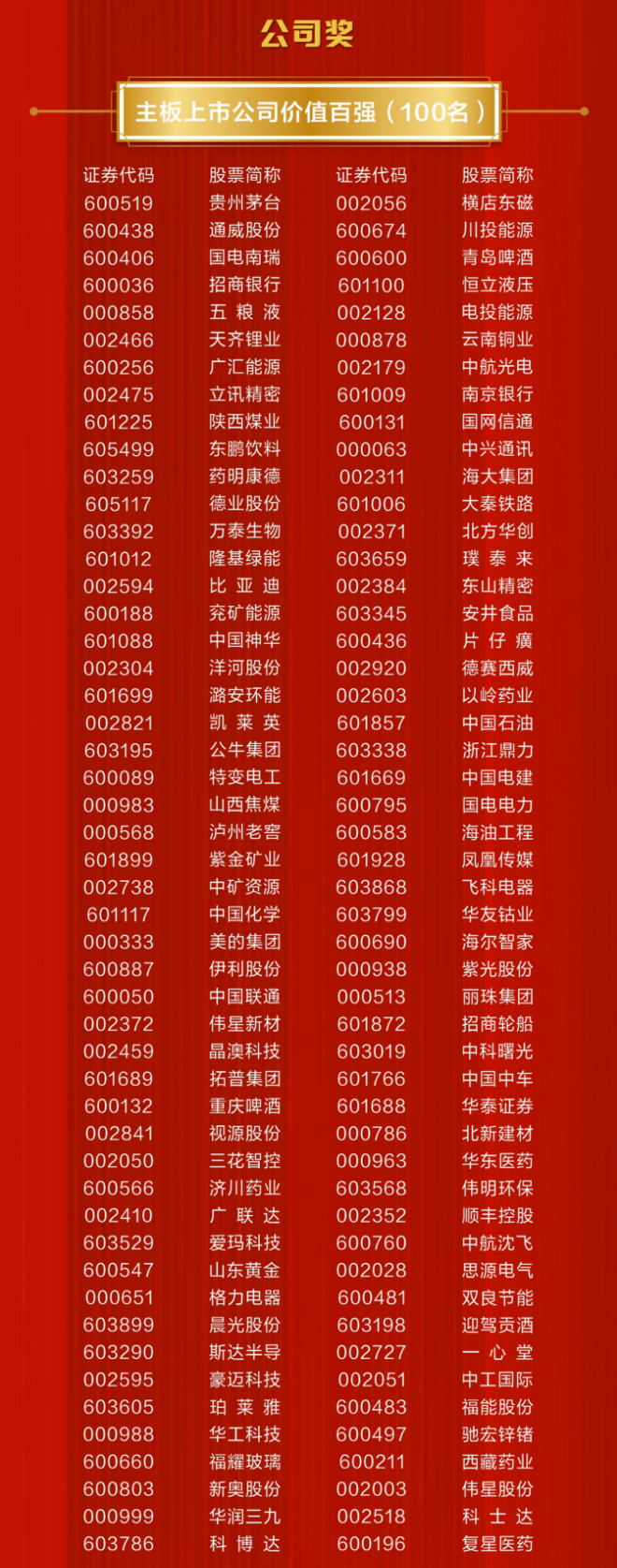 Top 100 Valuable China Main-Board Listed Company Awarded by Securities Times