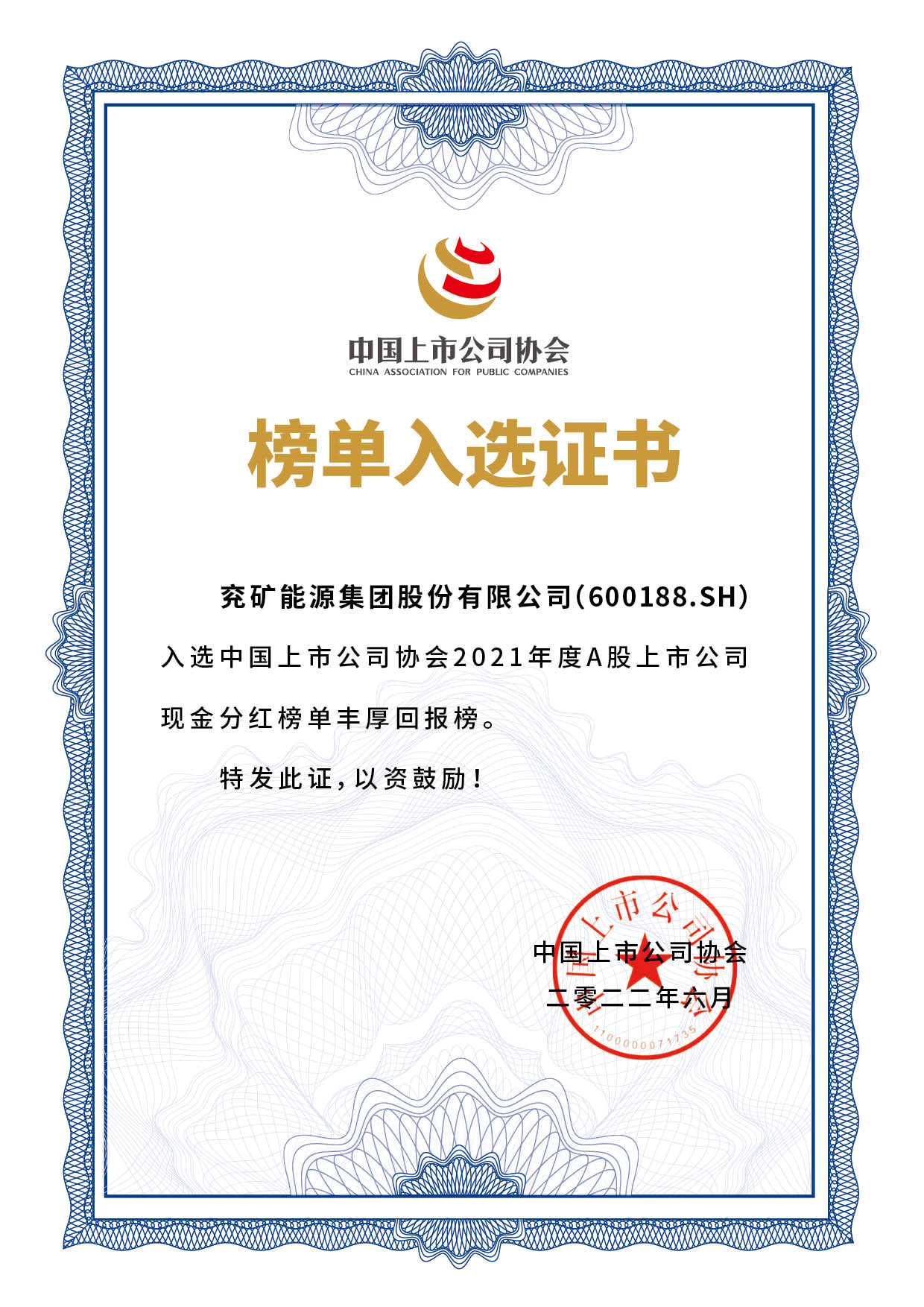 Generous Returns of Cash Dividend List Awarded by China Association of Public Companies